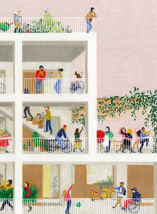 Ce projet interroge les modalités de conception de l’espace urbain, de l’édifice et du logement à partir de l’introduction du cycle au cœur du projet immobilier. L’accessibilité de chaque habitation par tout type de cycle (du tricycle au déambulateur) transforme le statut et l’usage des espaces communs depuis le rez-de-ville jusqu’au seuil du logement, et réintroduit dans le logement collectif la pratique et les qualités d’usage et de la maison individuelle. Il propose ainsi de répondre aux désirs paradoxaux des habitants : « d’habiter en ville mais à la campagne », « dans une maison mais ensemble ».